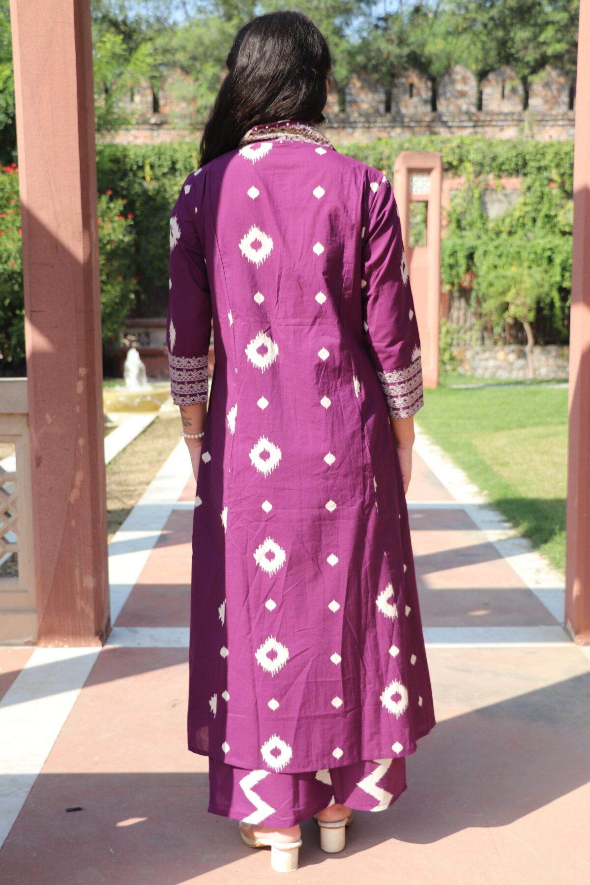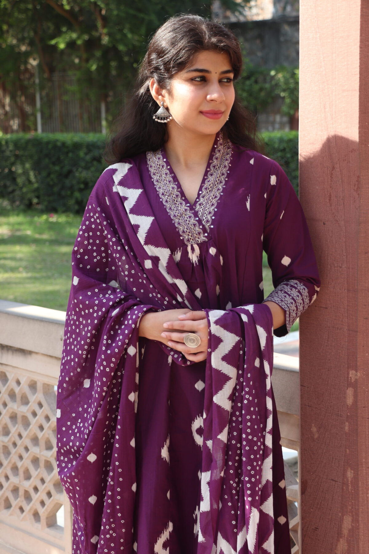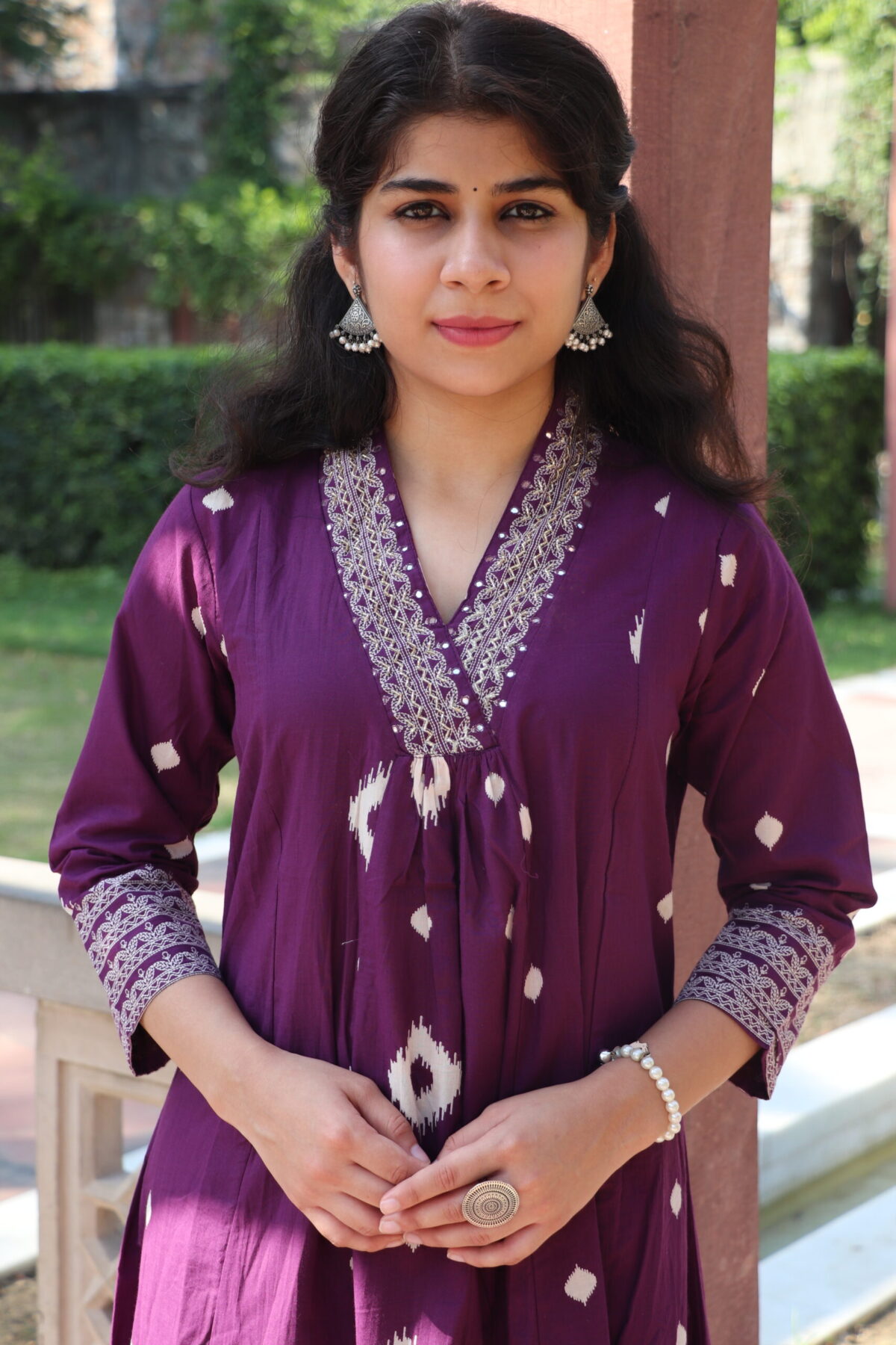 + Free ShippingElevate your ethnic style with our Royal Plum Embroidered Kurta Set with Dupatta, crafted in soft fabric with intricate embroidery and delicate ikat patterns for timeless elegance.