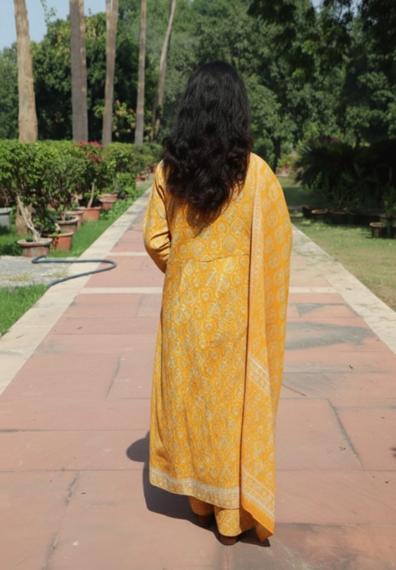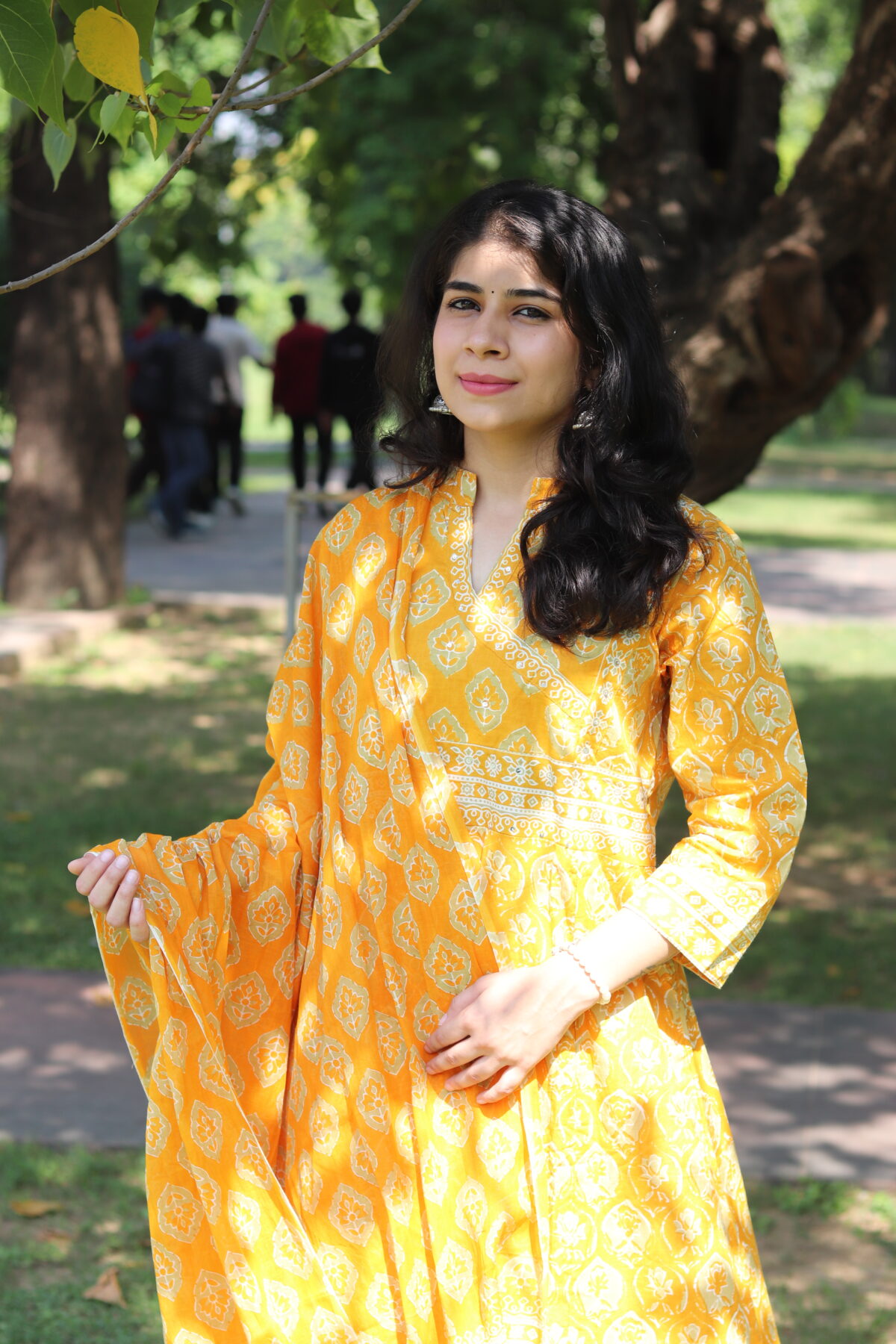 Radiate elegance in this vibrant yellow cotton kurta, designed with a notched V-neckline and Angrakha-style overlap for a touch of traditional charm. Crafted from soft, breathable cotton, it ensures comfort throughout the day while keeping your style effortlessly chic. Perfect for festive occasions, casual outings, or office wear, this kurta pairs beautifully with white or beige pants for a refined look.